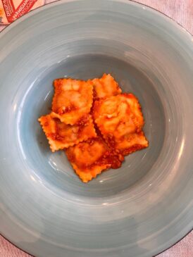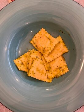 - Равиоли с рикота, спанак и орехово песто. Ореховото песто идва от района на Ла Специя.