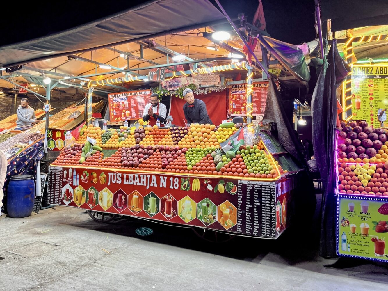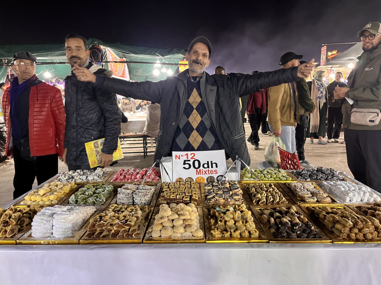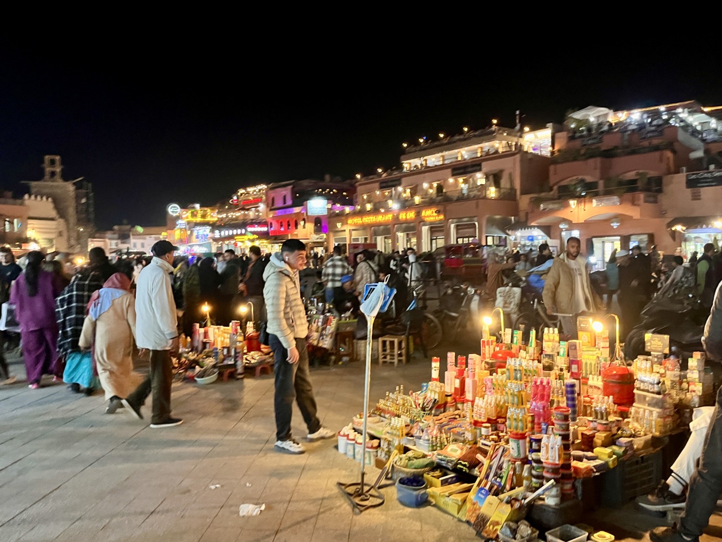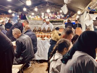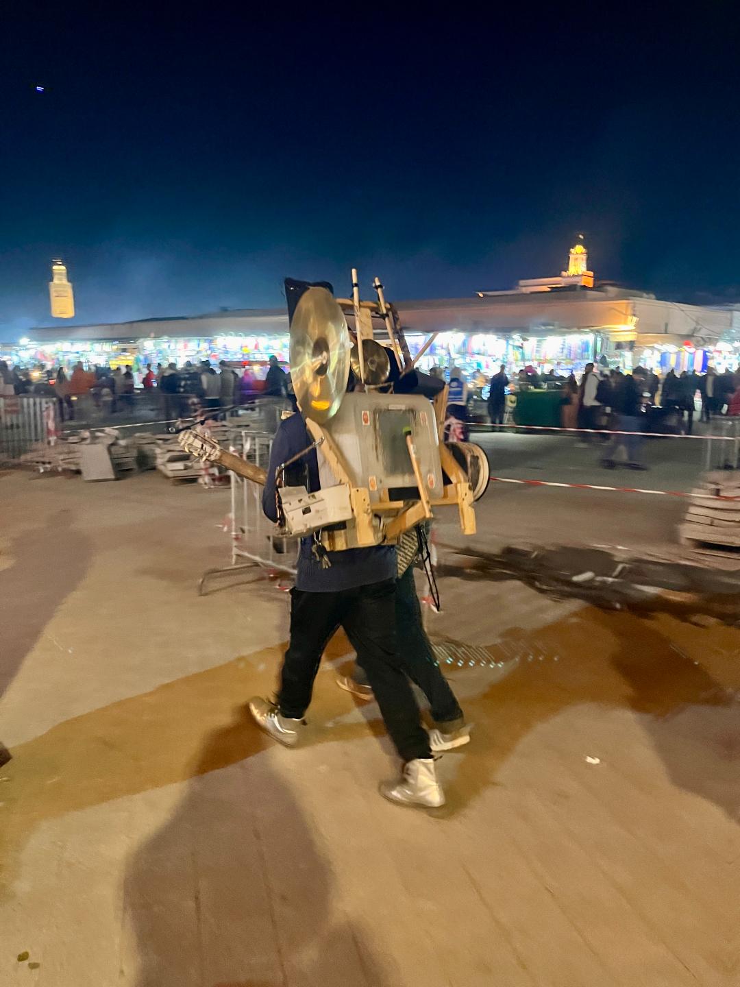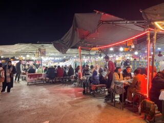 Оставихме багажа и веднага излязохме на разходка. Големият базар, The Grand Bazar, разположен на площад Jemaa el-Fnaa не може да се опише с думи или със снимки – трябва да се преживее. Навсякъде се носеше дим от тамян и т.н. “викачи” постоянно ни подканяха да ядем улична храна в импровизираните им заведения. Още имаше произволно образувани кръгове от групи хора – къде се танцуваше, къде се свиреше и пееше, къде се играеха игри с награди. Този базар оживява всяка вечер със залеза на Слънцето и продължава до късно вечерта. На следващата сутрин нямаше и помен от него, дори липсваха ресторантчетата за улична храна. Само разни хора с маймунки се разхождаха напред-назад из празния площад и предлагаха снимки с животинките.