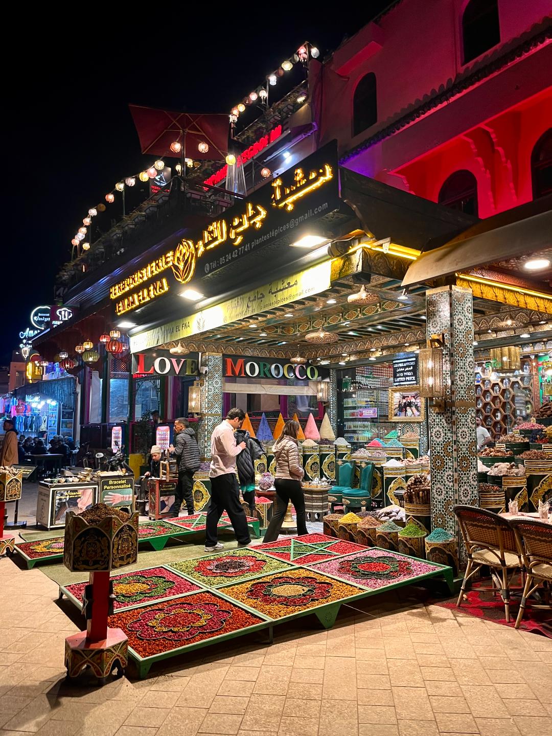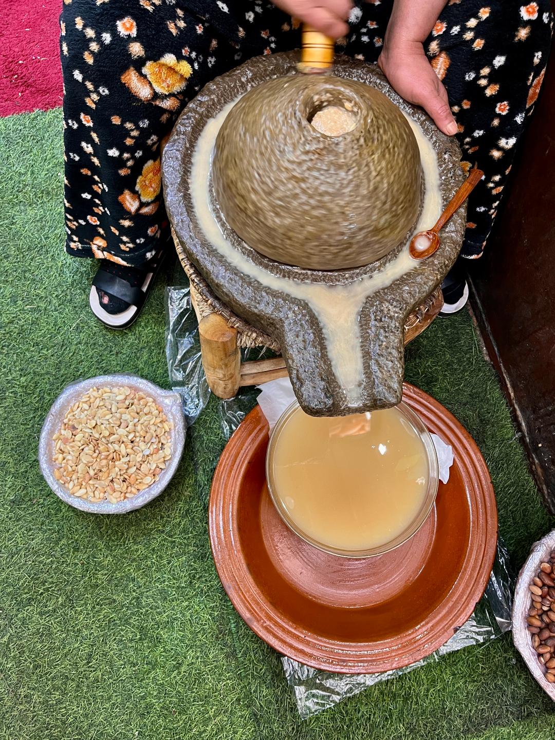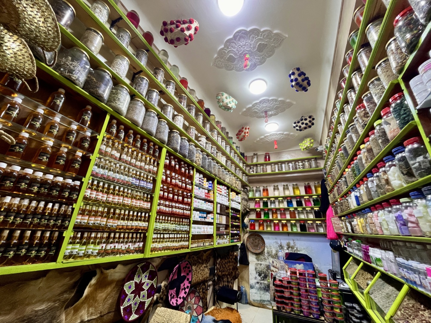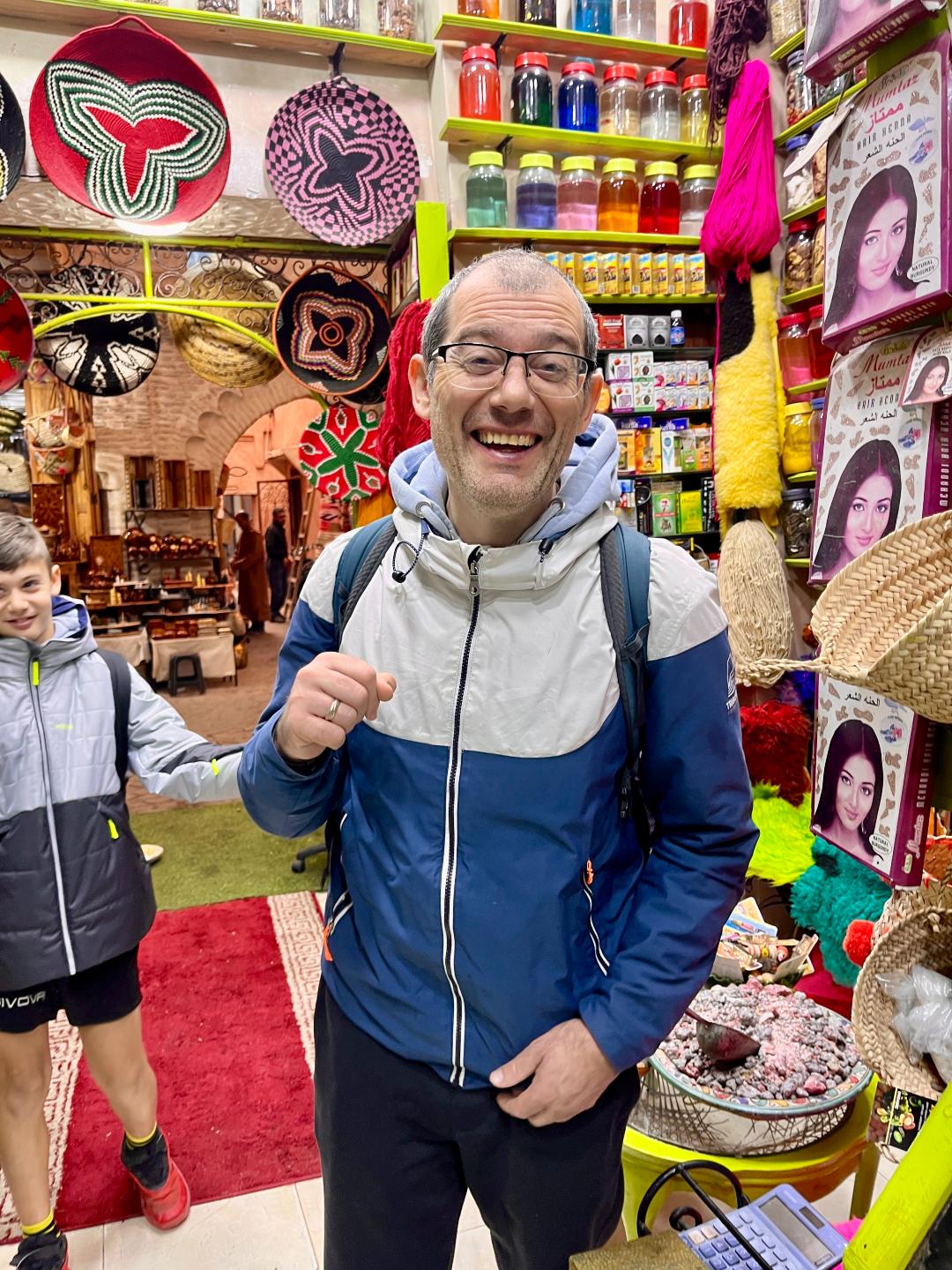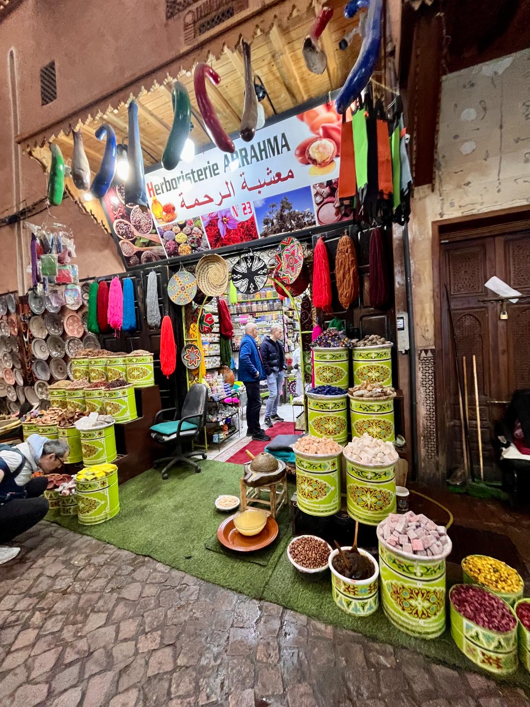 Доста време се застояхме в един магазин с всякакви местни подправки, аромати, сапуни и др., откъдето накупихме сухи парфюми и няколко шишенца натурално арганово масло. Точно пред магазина имаше преса за арганови ядки, където една жена извличаше арганово масло. В този същия магазин продавачката много културно ни агитираше да купим различни продукти като ни даваше да ги пробваме – например показа ни ефекта от семената на черния кимион, които като се натъркат на памучен плат и се вдишат дълбоко през ноздрата, помагат при мигрена и главоболие, а евкалиптът помагал при проблеми със синусите.