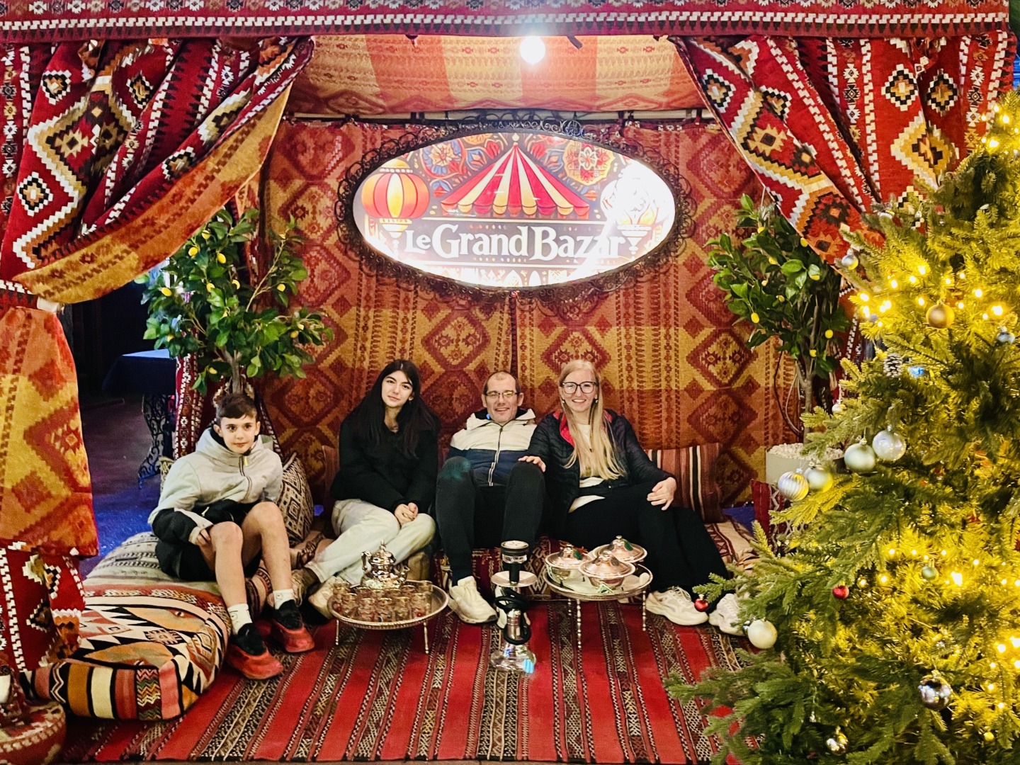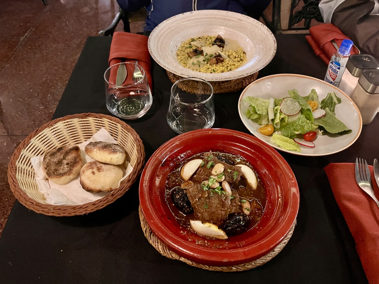 Децата не харесаха ориенталската атмосфера на Големия базар и затова бързо се ориентирахме да търсим ресторант за вечеря. Спряхме се на Restaurant Le Grand Bazar Marrakesh и уцелихме в десятката. Абсолютно препоръчвам този ресторант! Намира се на втория етаж, непосредствено до Базара. Атмосферата в ресторанта бе много уютна, тиха, спокойна, а храната – сервирана в сравнително малки порции, но удивително вкусна! Обслужването бе от костюмирани сервитьори – на ниво като в изискан френски ресторант. Цените на ястията естествено бяха по-високи спрямо стандарта там – между 80 и 200 дирхама.