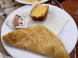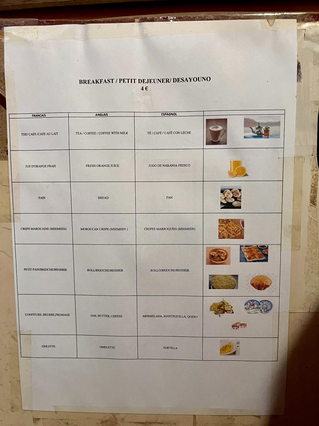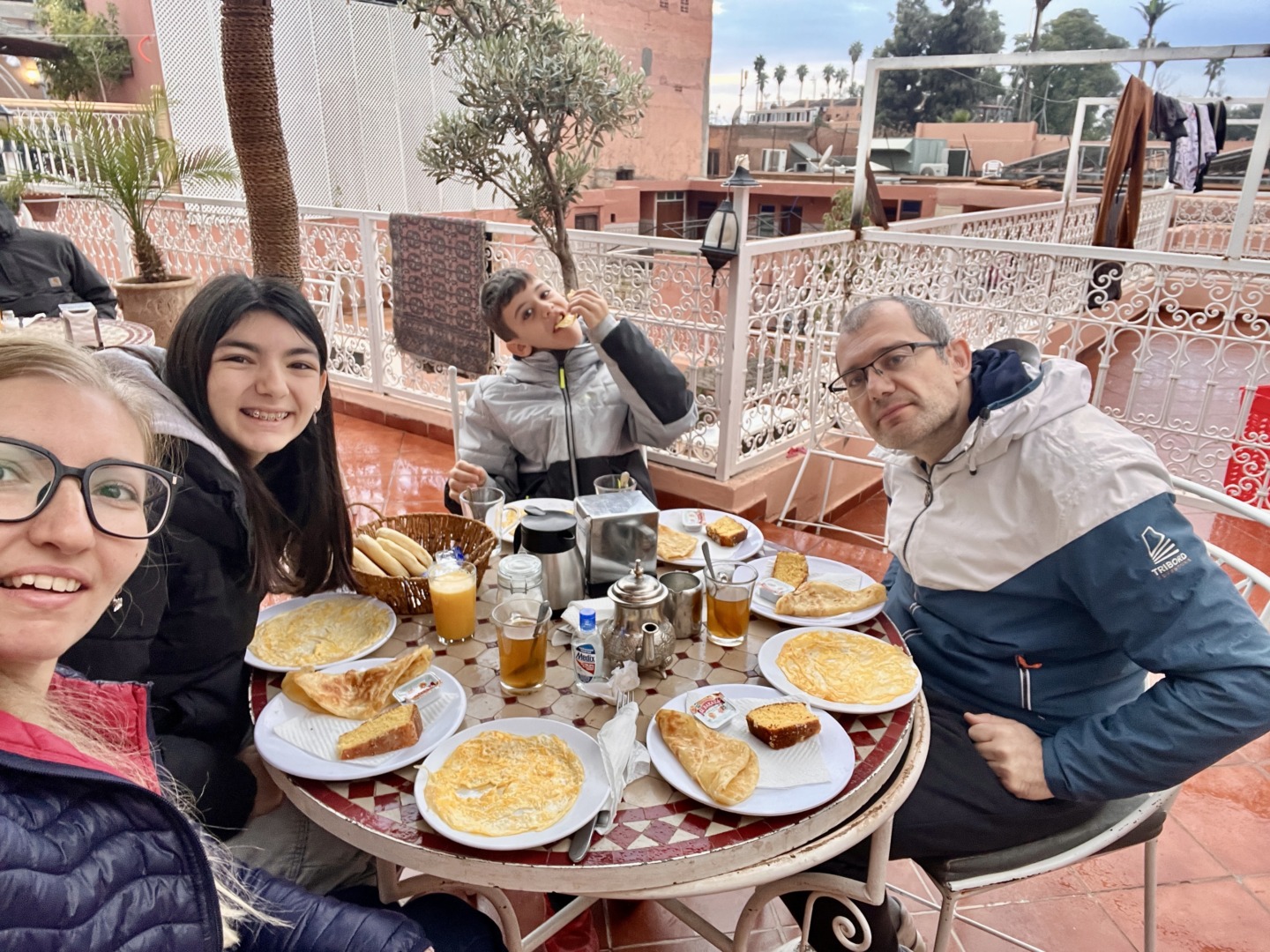 На следващата сутрин имахме изобилна закуска, която бе на покрива на хотела и се състоеше от кафе/чай/фреш от портокал, хлебчета, марокански палачинки (M’semen), кекс, мармалад, масло, омлет.