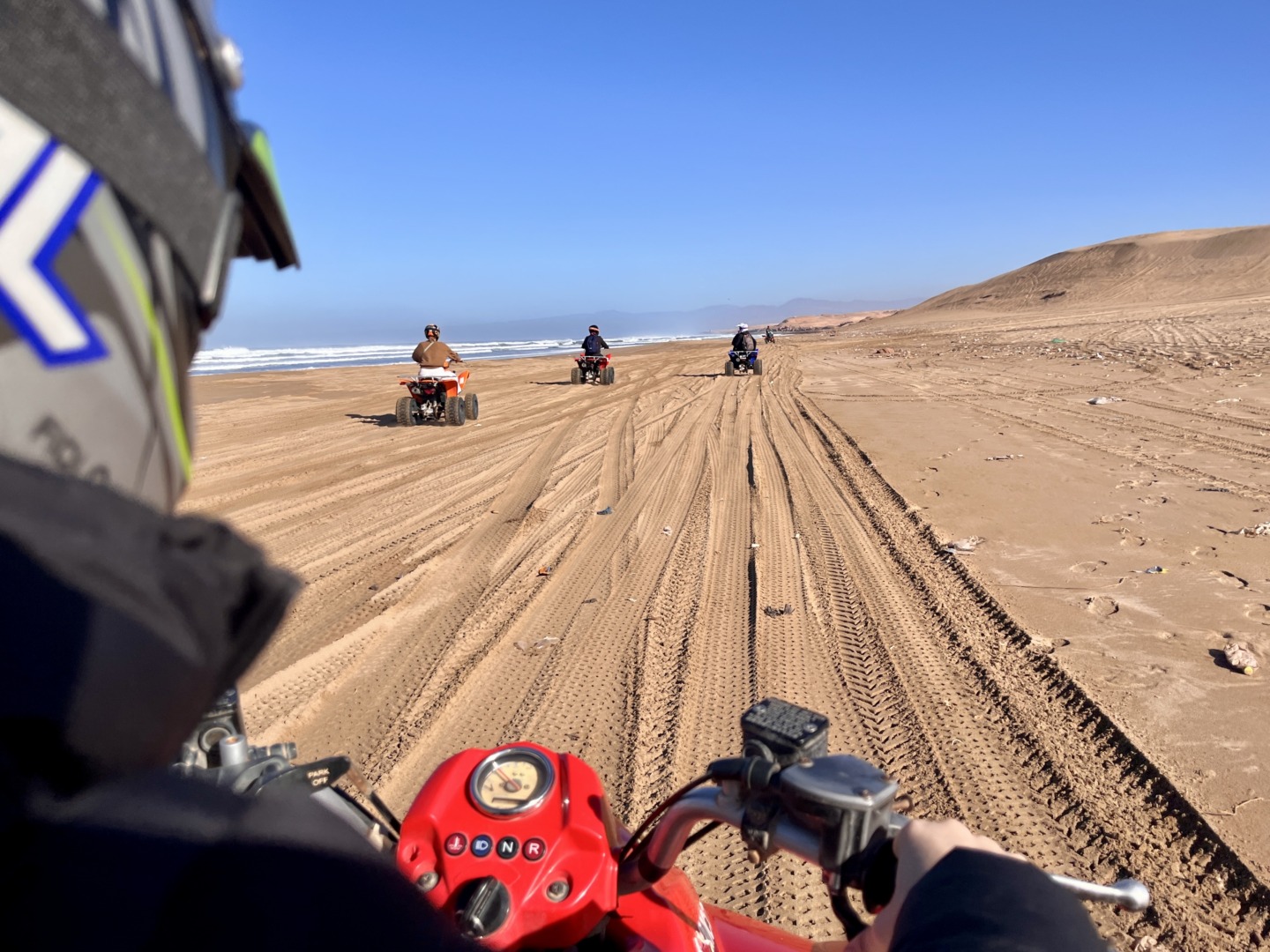 В крайна сметка бяхме малка група от 9-10 човека и се придвижвахме с микробус до едно селце близо до дюните, откъдето подкарахме бъгитата. Бяхме по двама на бъди, за да има как да правим безброй снимки и видеа 🙂 Шегувам се, така цената бе почти двойно по-ниска. Първоначално карахме по асфалт, след това по пресечен терен и накрая – в пясъка. Гледката бе абсолютно невероятна! Антлантическият океан бе от едната ни страна, а пясъчните дюни – от другата. Общо карането на бъги продължи около час и половина като по средата на това време спряхме до едни големи дюни, изкатерихме ги и там правихме сандсърфинг. Гледката отгоре към съседните дюни бе още по-невероятна – пясъчните дюни изглеждаха точно като че ли си дълбоко в пустинята. Кратко ни се стори цялото преживяване и затова решихме, че на следващия ден, когато сме в Маракеш, ще включим отново каране на бъги в програмата, защото на всички много ни хареса.
