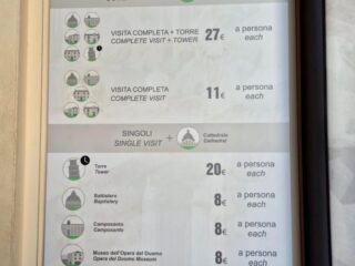 Интересен факт е, че другото име на Катедралният площад, където са разположени Наклонената кула, Катедралата на Пиза и баптистерият, е “Площадът на чудесата”. И предния път забравих, и този път отново, че влизането в Катедралата става с безплатен билет, който се взима от билетната каса на комплекса. Влизането в останалите сгради е платено. Актуална цена на билетите може да проверите ТУК. Имайте предвид, че в кулата се влиза на малки групи от хора и под точно определен час. Не са позволени никакви чанти. Тях трябва да оставите на гардероб. На входа правят проверки за багажа.