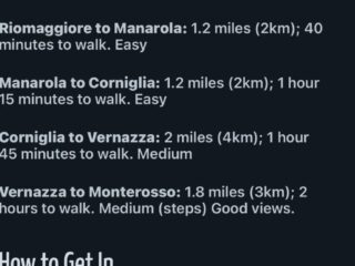 Важно! Бъдете внимателни за личните си вещи особено в пълните с тълпи улички като този съвет е общовалиден за цяла Италия и не само. Също така внимавайте по жп гарите в района, защото някои регионални влакове въобще не намалят скоростта си и минават през иначе малките селски гари с много висока скорост – това ни се случи на жп гарите във Вернаца и Монтеросо Ал Маре.