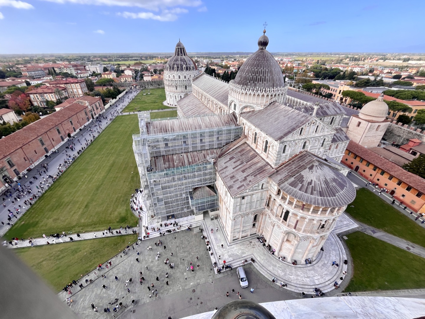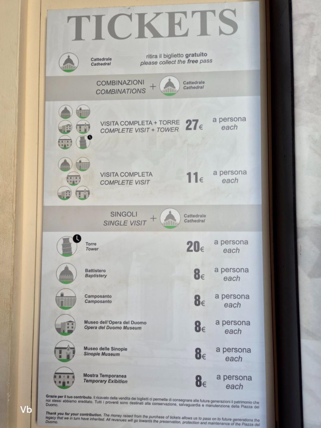Интересен факт е, че другото име на Катедралният площад, където са разположени Наклонената кула, Катедралата на Пиза и баптистерият, е “Площадът на чудесата”. И предния път забравих, и този път отново, че влизането в Катедралата става с безплатен билет, който се взима от билетната каса на комплекса. Влизането в останалите сгради е платено. Актуална цена на билетите може да проверите ТУК. Имайте предвид, че в кулата се влиза на малки групи от хора и под точно определен час. Не са позволени никакви чанти. Тях трябва да оставите на гардероб. На входа правят проверки за багажа.