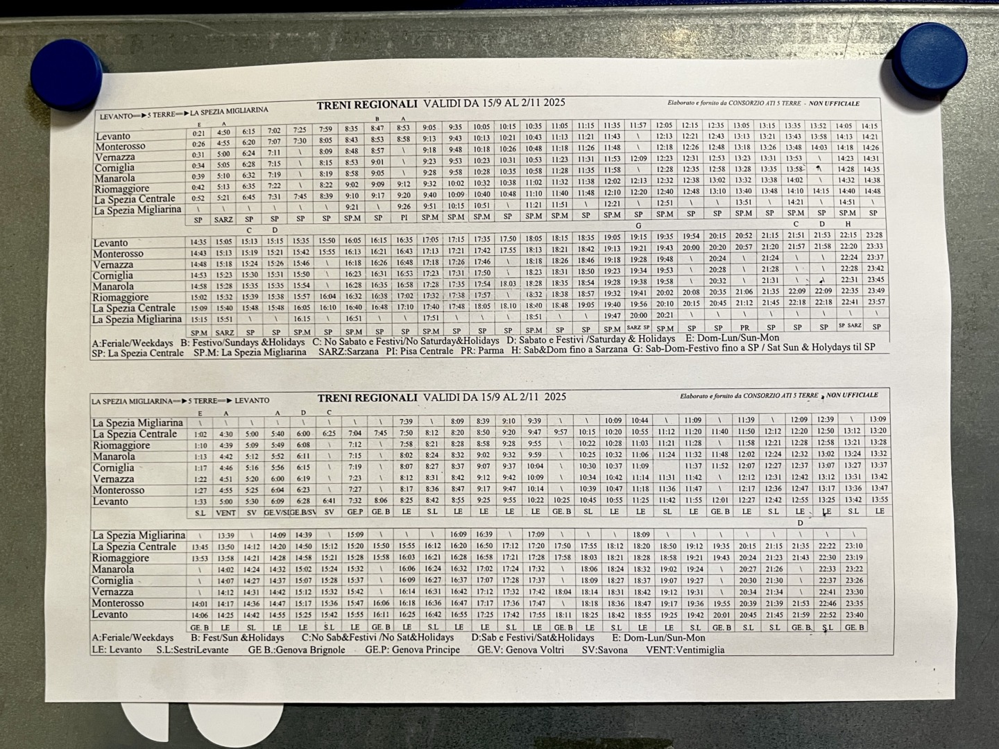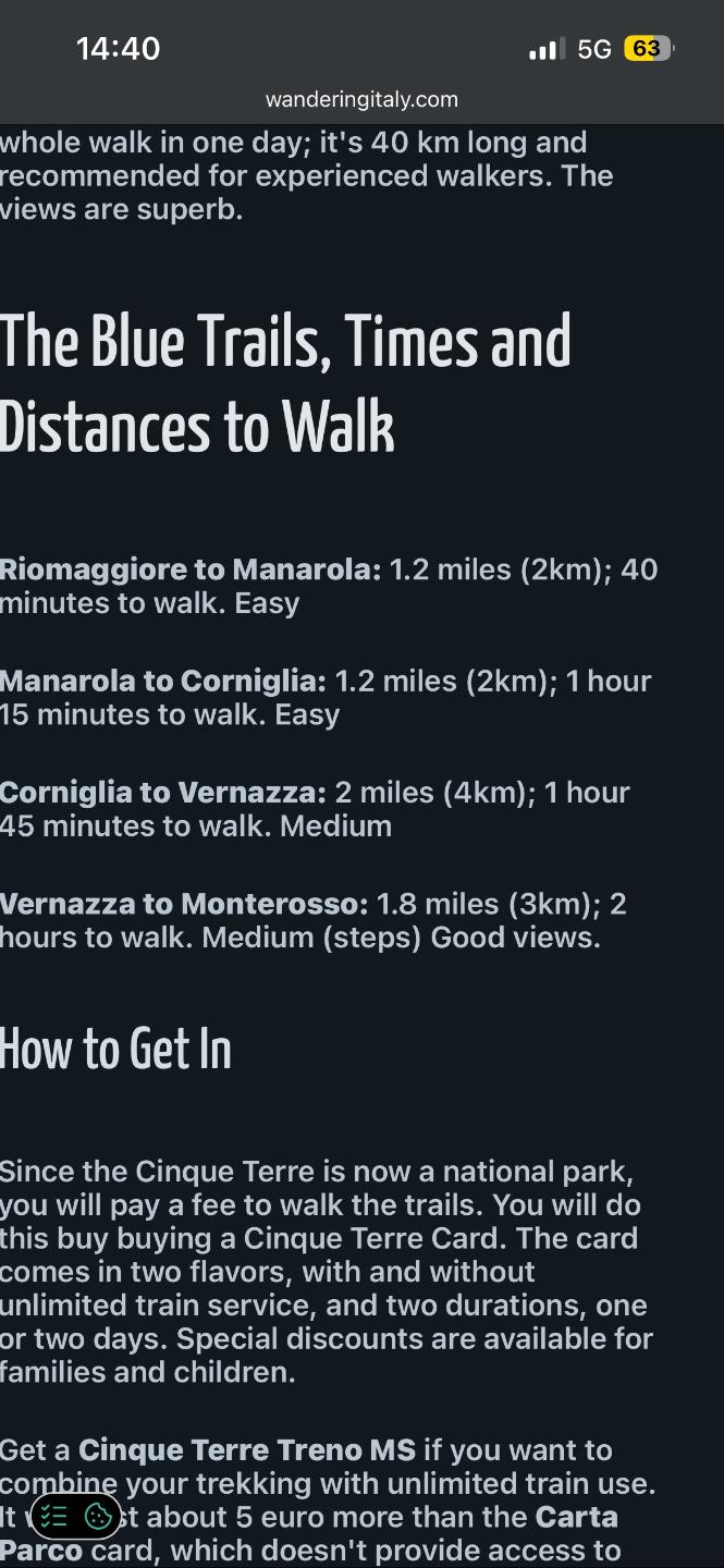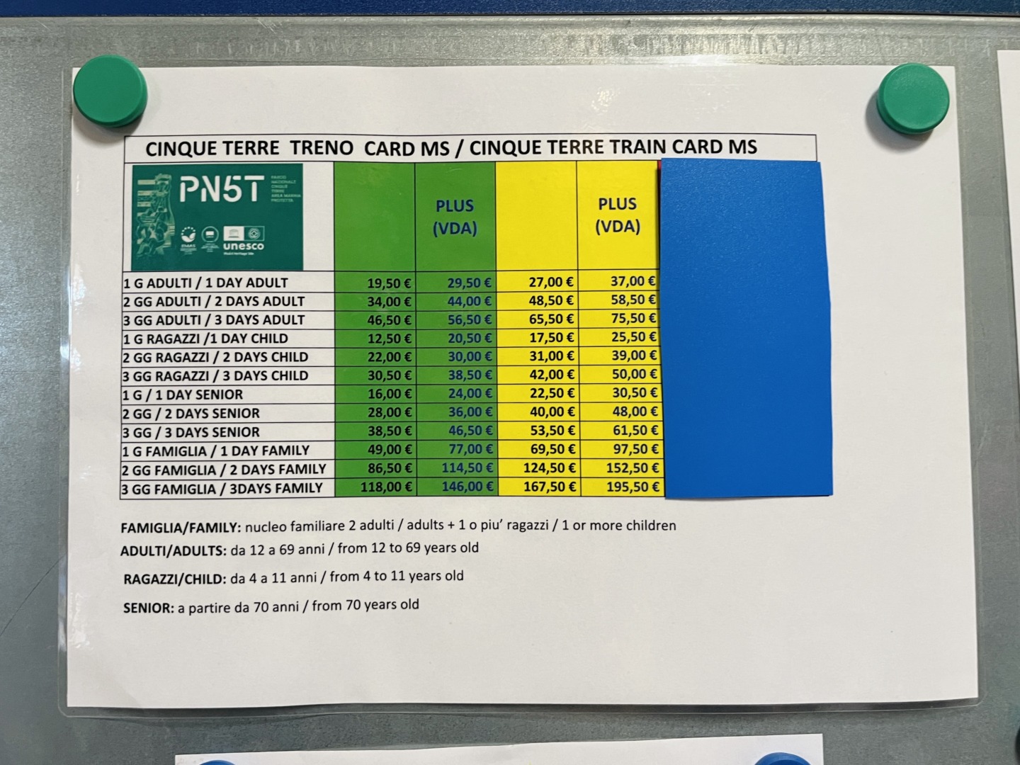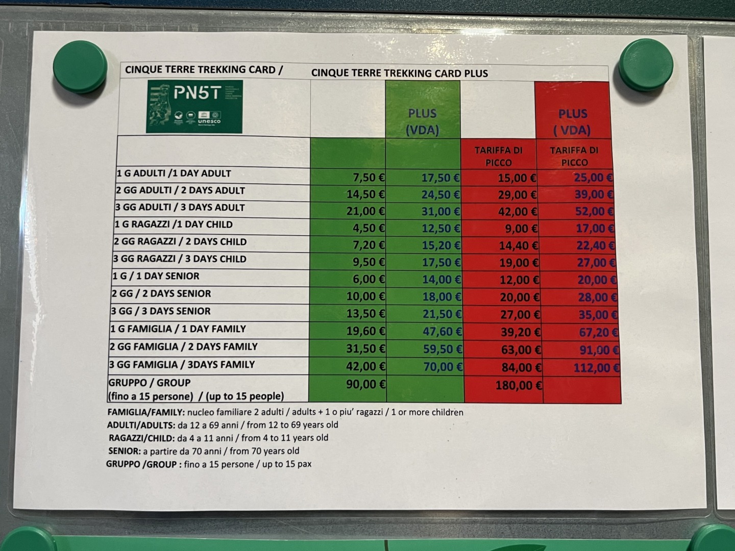 Важно! Бъдете внимателни за личните си вещи особено в пълните с тълпи улички като този съвет е общовалиден за цяла Италия и не само. Също така внимавайте по жп гарите в района, защото някои регионални влакове въобще не намалят скоростта си и минават през иначе малките селски гари с много висока скорост – това ни се случи на жп гарите във Вернаца и Монтеросо Ал Маре.